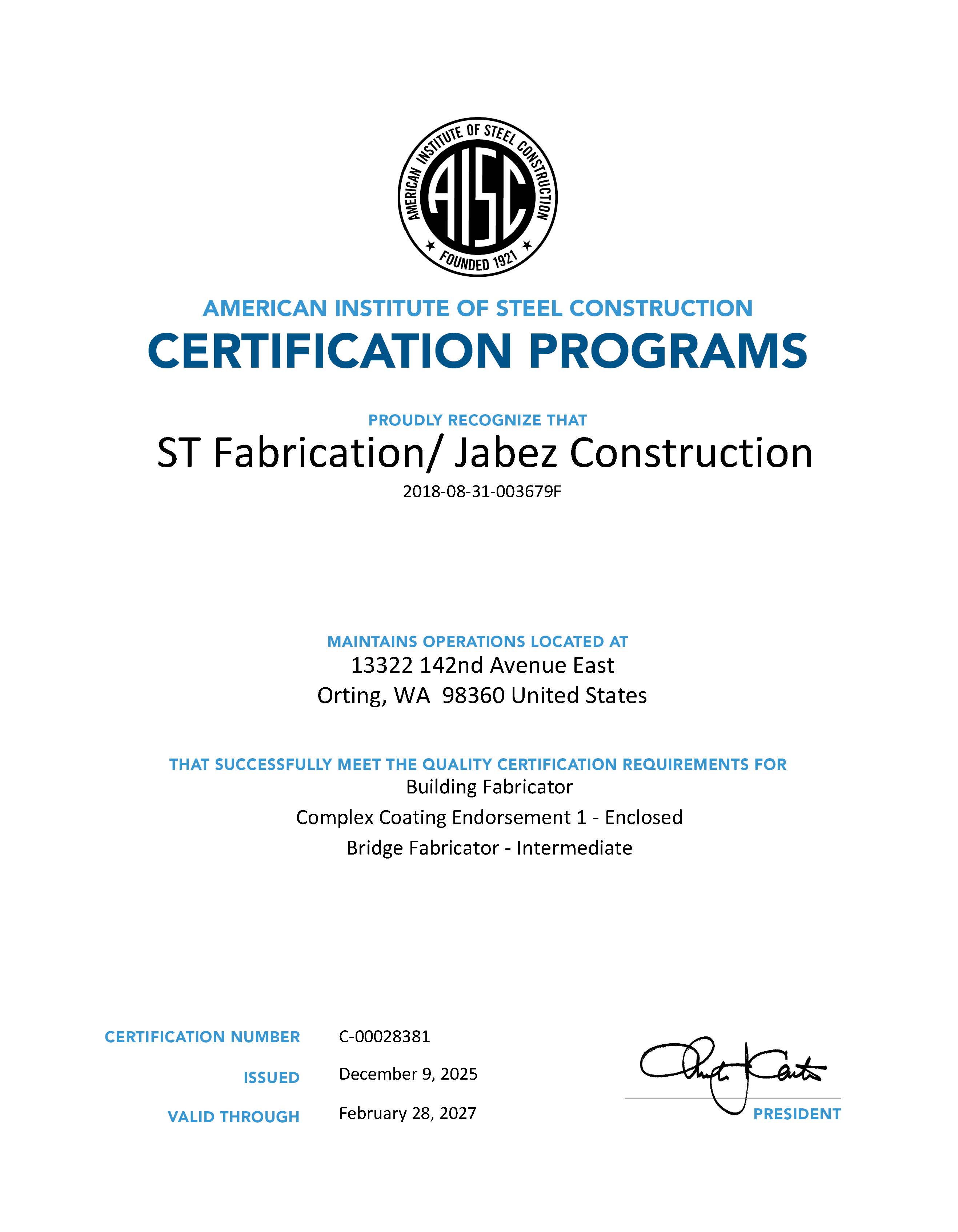 Jabez Holdings, Inc., "DBA" ST Fabrication/Jabez Construction A Washington State CorporationFEDERAL TIN: 68-0511809